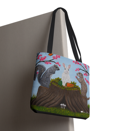Garden Gathering Tote Bag – Original Art by Roberta Pacino, Whimsical Woodland Animal Design, All-Over Print