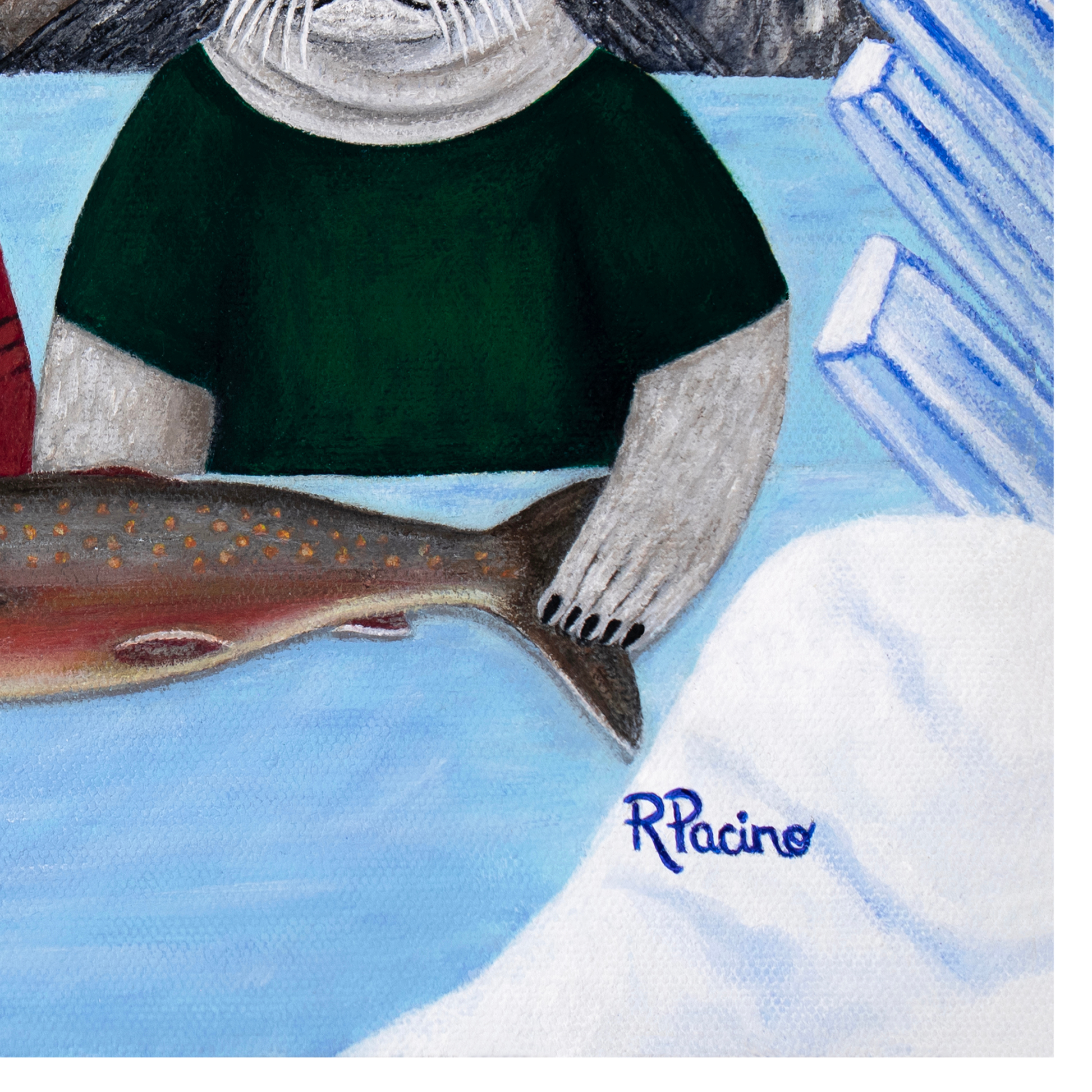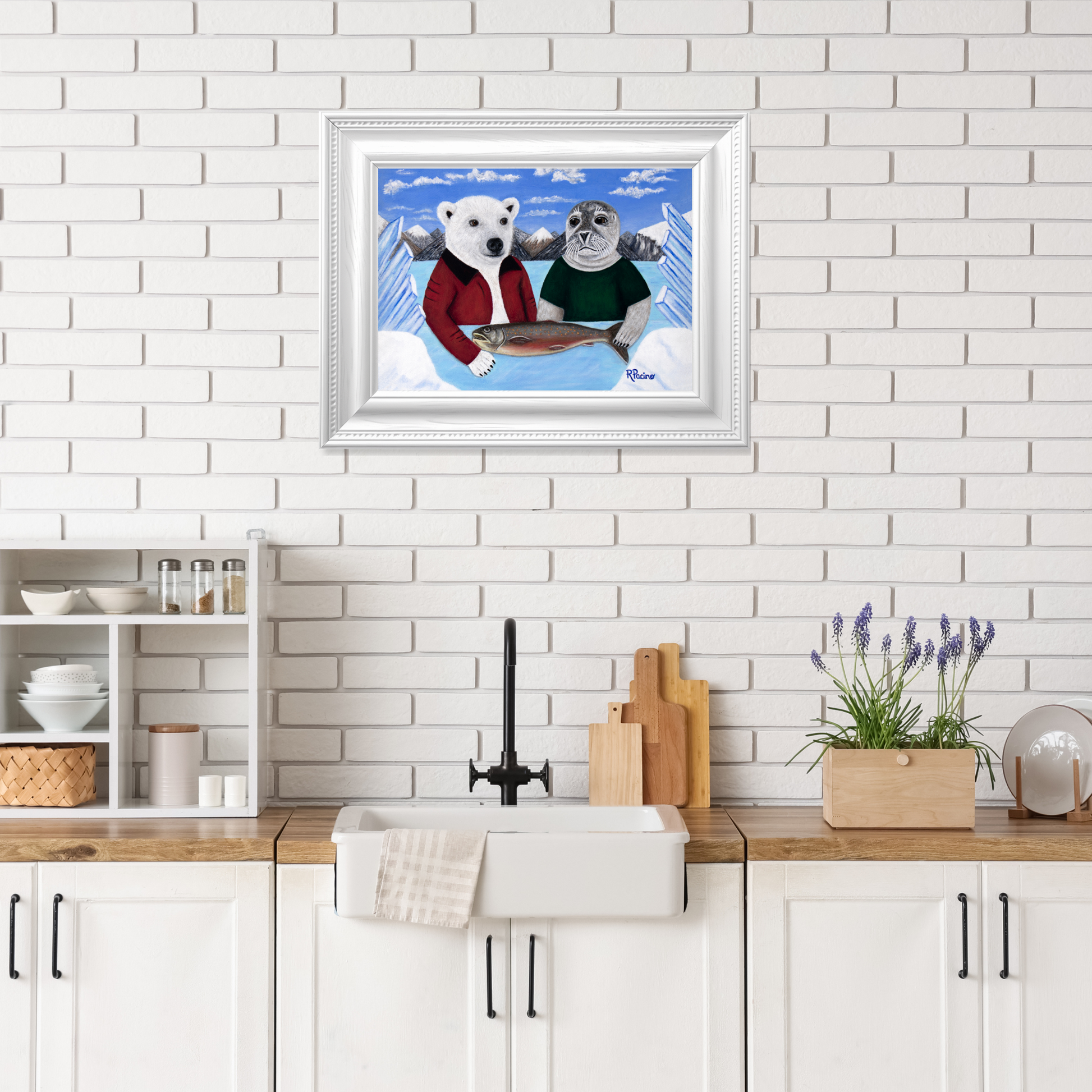 Arctic Appetite brings a touch of wonder, humor, and heart to the icy North. In this whimsical scene, a polar bear in a red coat and a harp seal in a green dress share a fresh catch beneath a brilliant blue sky, surrounded by snow, ice, and distant mountain peaks. Their quiet meal feels both playful and tender, inviting the viewer into a world where animals gather with personality, presence, and charm.