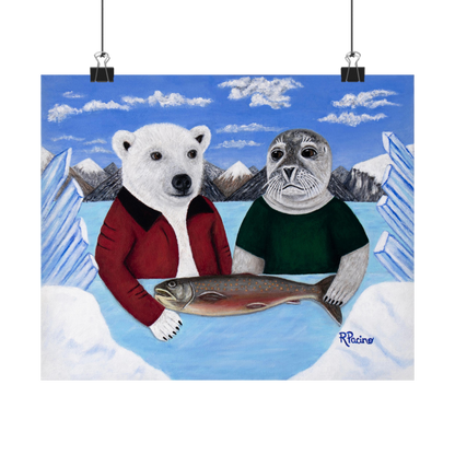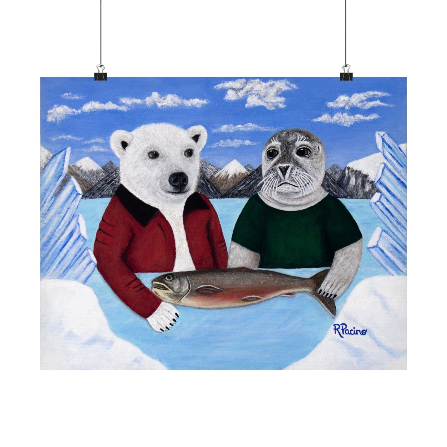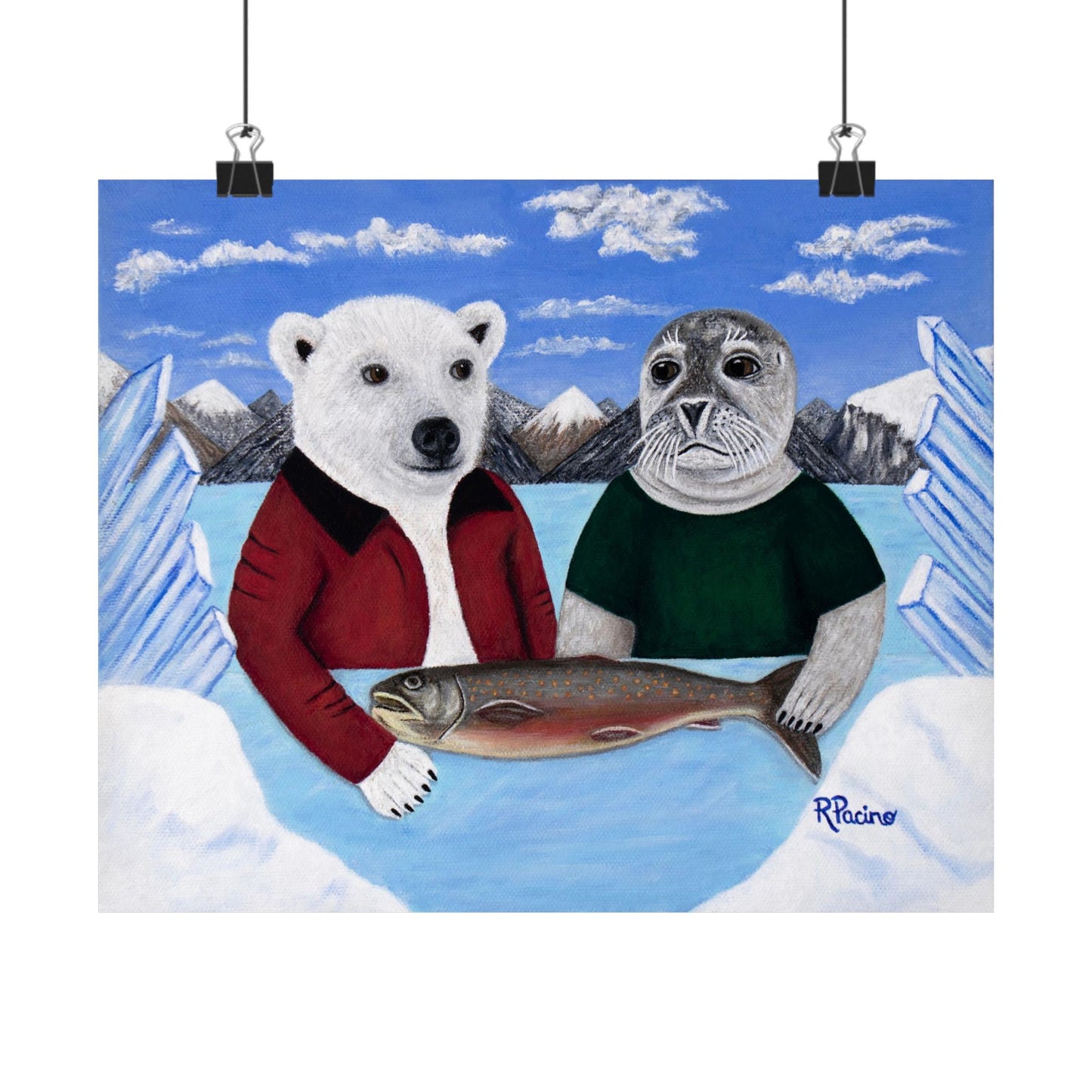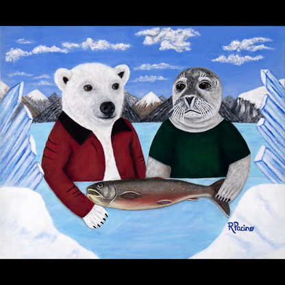 Introducing Arctic Appetite, a whimsical fine art print by Roberta Pacino that captures a playful yet elegant winter dining scene. Blurring the boundaries between the animal kingdom and human world, this enchanting piece showcases a dressed-up polar bear and harp seal indulging in a shared meal, set against a serene Arctic backdrop.