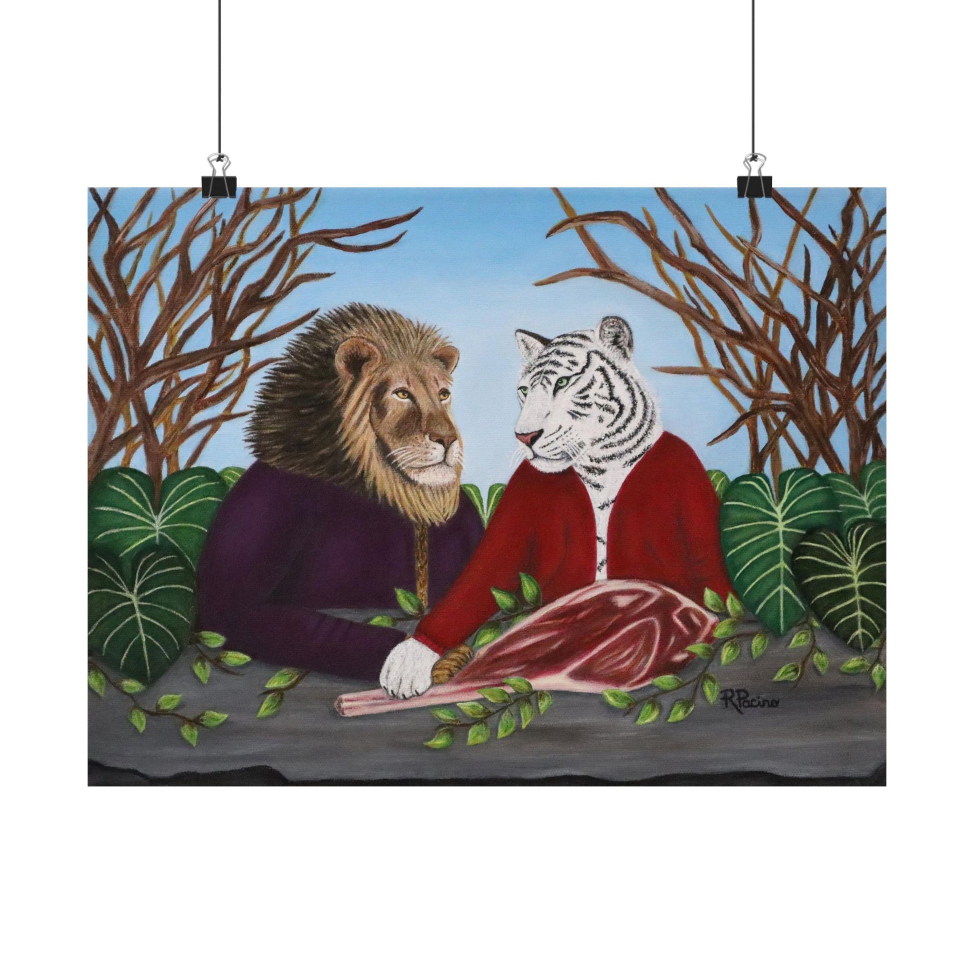Step into the majestic world of King’s Table, a captivating fine art print by Roberta Pacino, where the undeniable power and grace of the wild merge with a thought-provoking narrative. In this striking composition, a lion and tiger share a meal in a setting that blurs the lines between camaraderie and competition. The tiger’s paw rests over the lion’s—a gesture that could be seen as a sign of friendship or a subtle assertion of dominance, inviting the viewer to decide the story behind this meeting of kings.