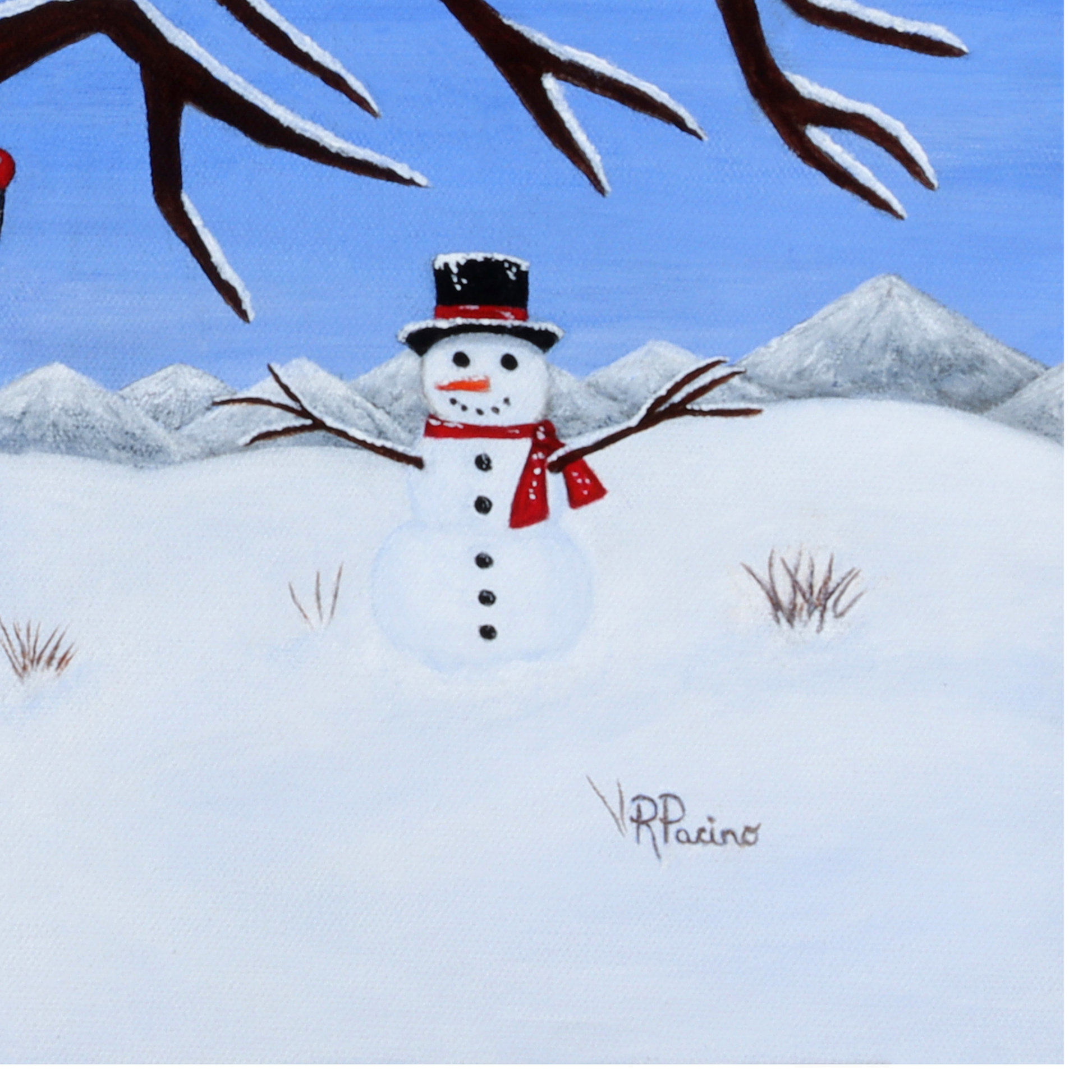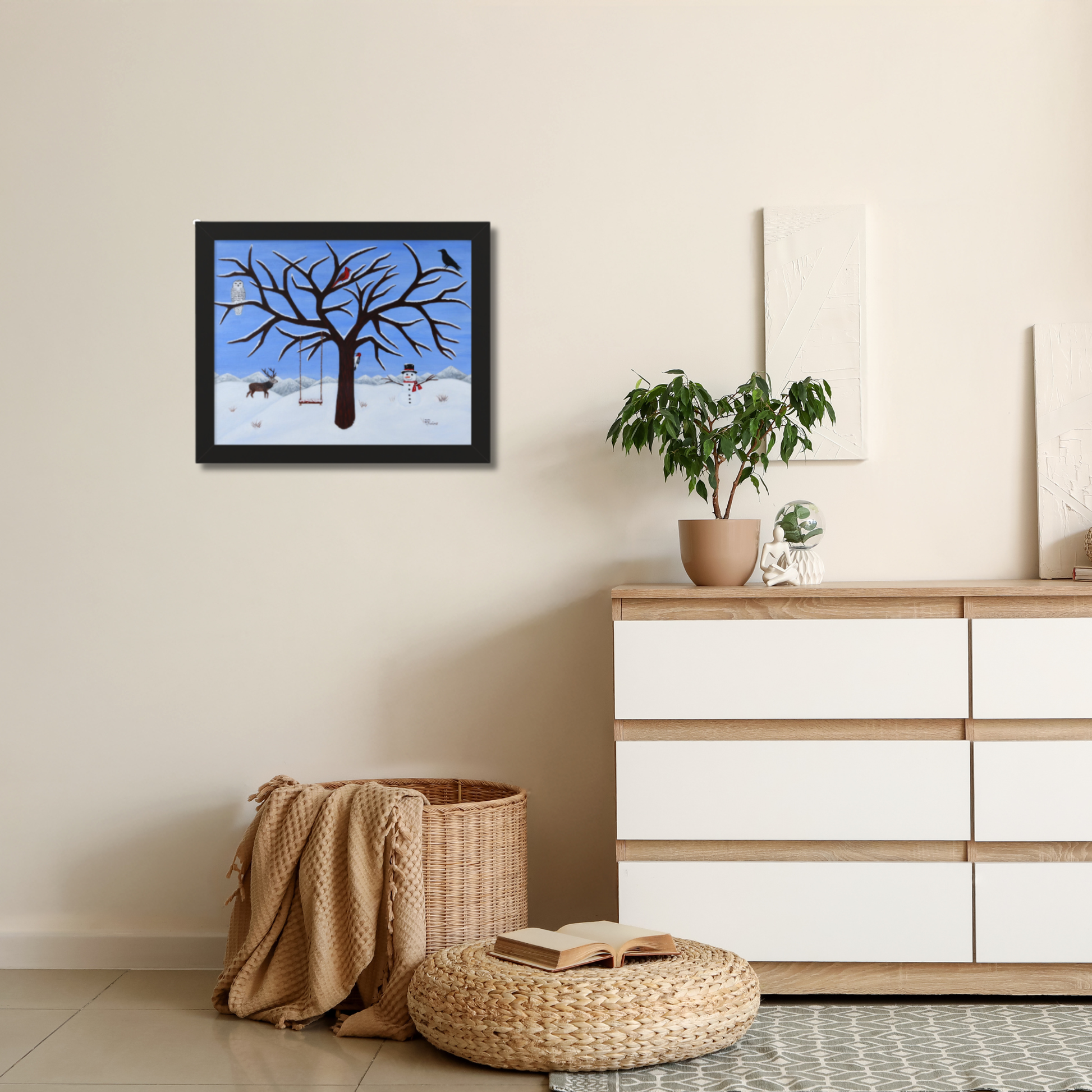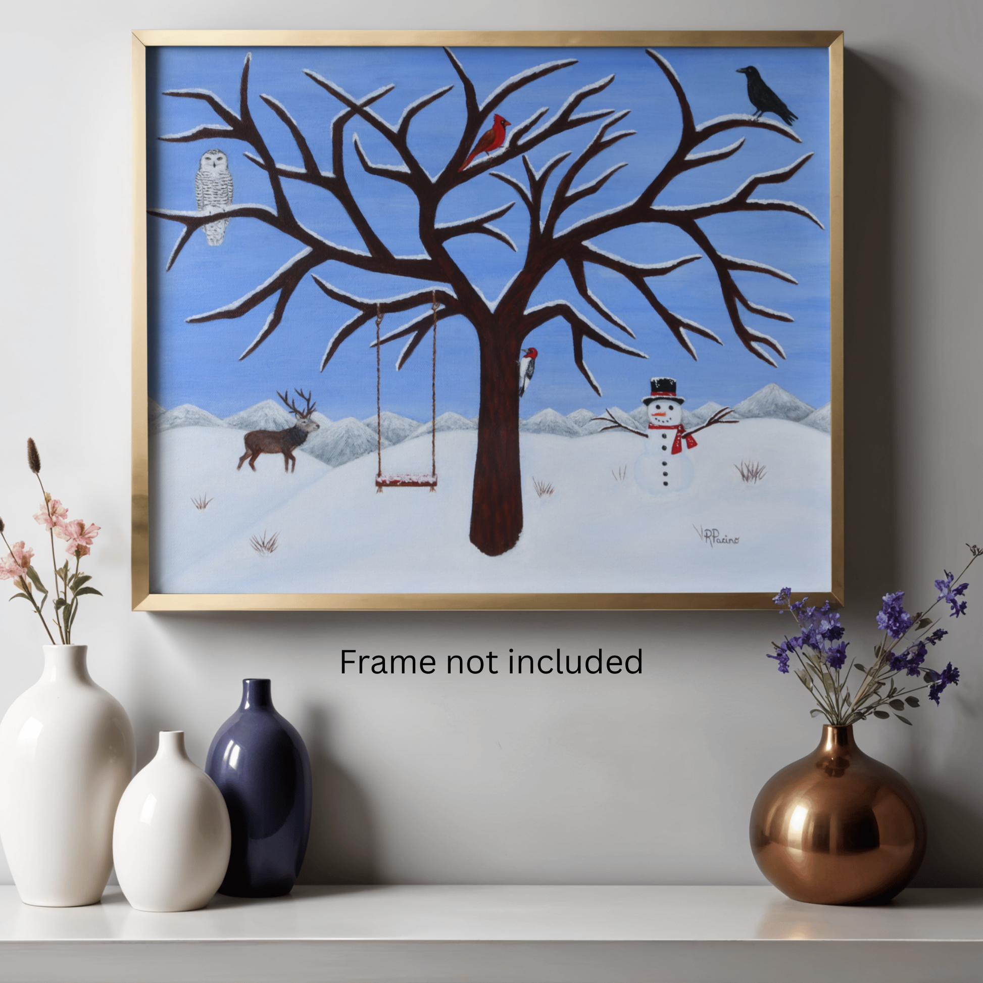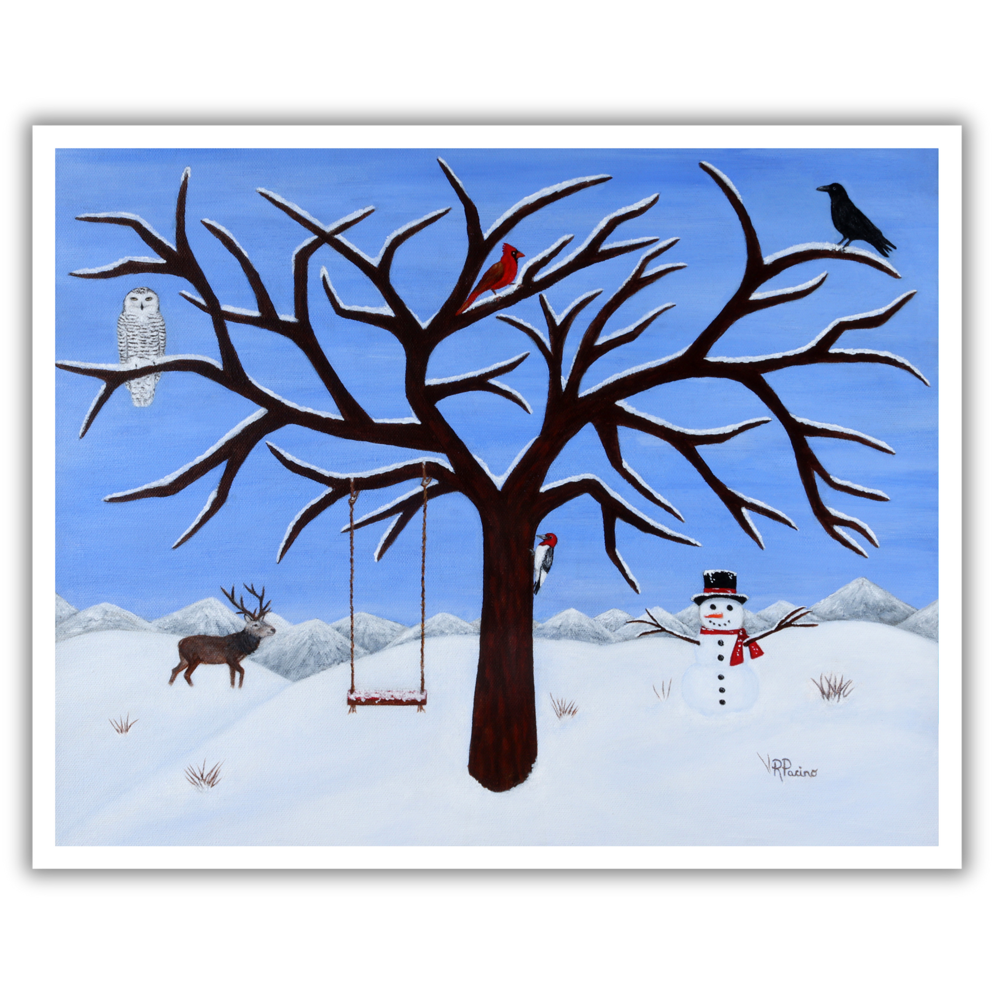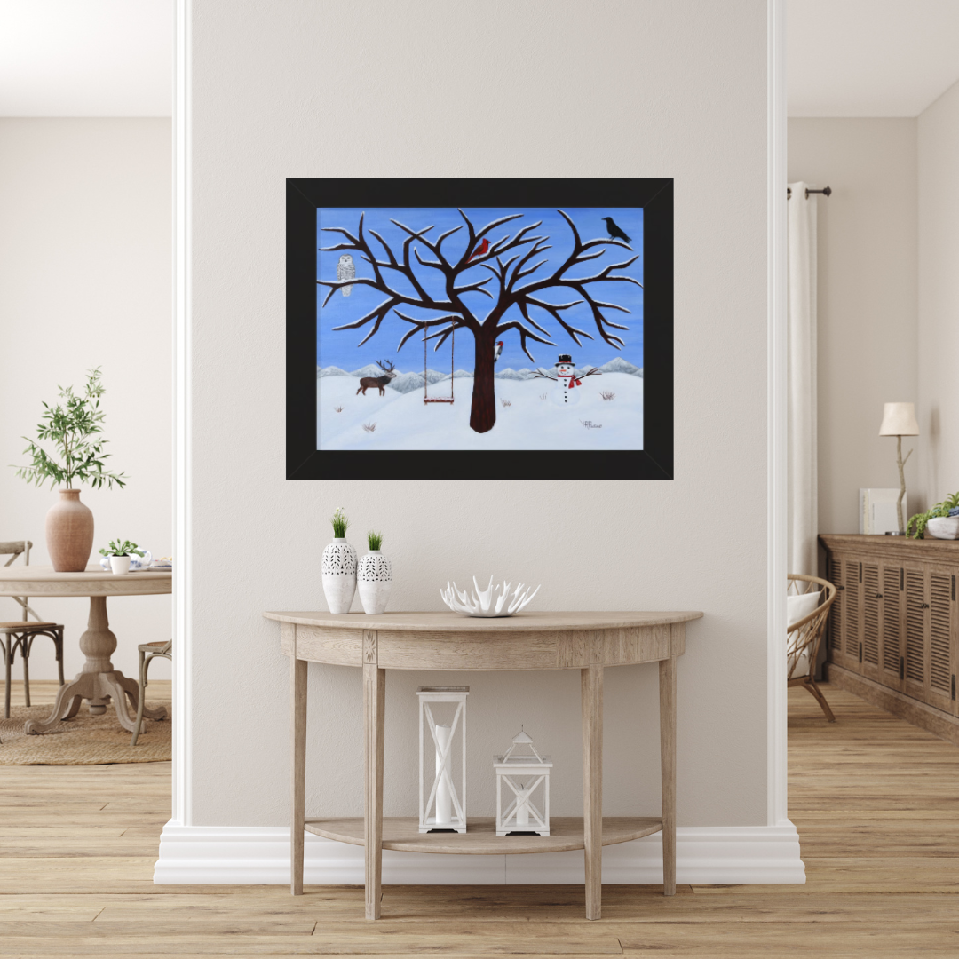 Pure Presence invites you into a serene winter woodland where stillness and quiet wonder gently unfold. Beneath a snow-laden sky, a majestic guardian tree shelters a gathering of woodland companions — a snow owl, cardinal, crow, woodpecker, and noble buck — each inhabiting the peaceful rhythm of the season. A cheerful snowman and a simple tree swing add a touch of warmth and childlike joy, creating a moment that feels both magical and grounded in nature’s calm.
