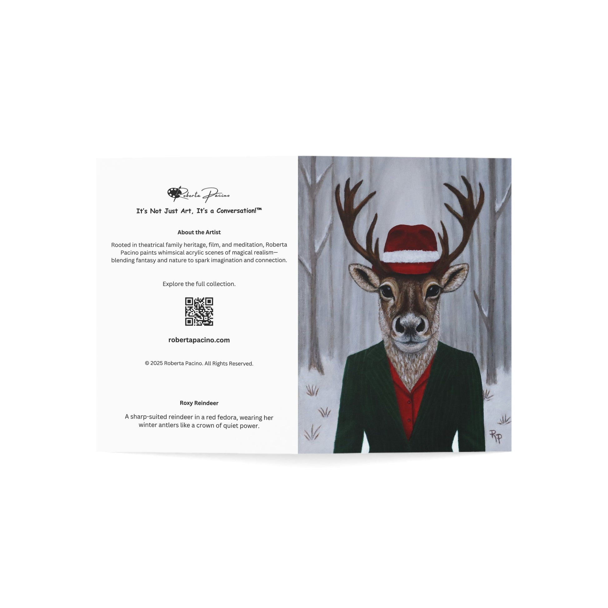 A sharp-suited reindeer in a green pinstripe jacket and red fedora steps out of a quiet winter forest, wearing her antlers like a winter crown. Roxy Reindeer brings a touch of holiday glamour and quiet power to your mantle, mailbox, or gift box—perfect for anyone who loves whimsical art, strong feminine energy, and a hint of story in every image.