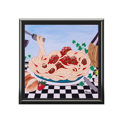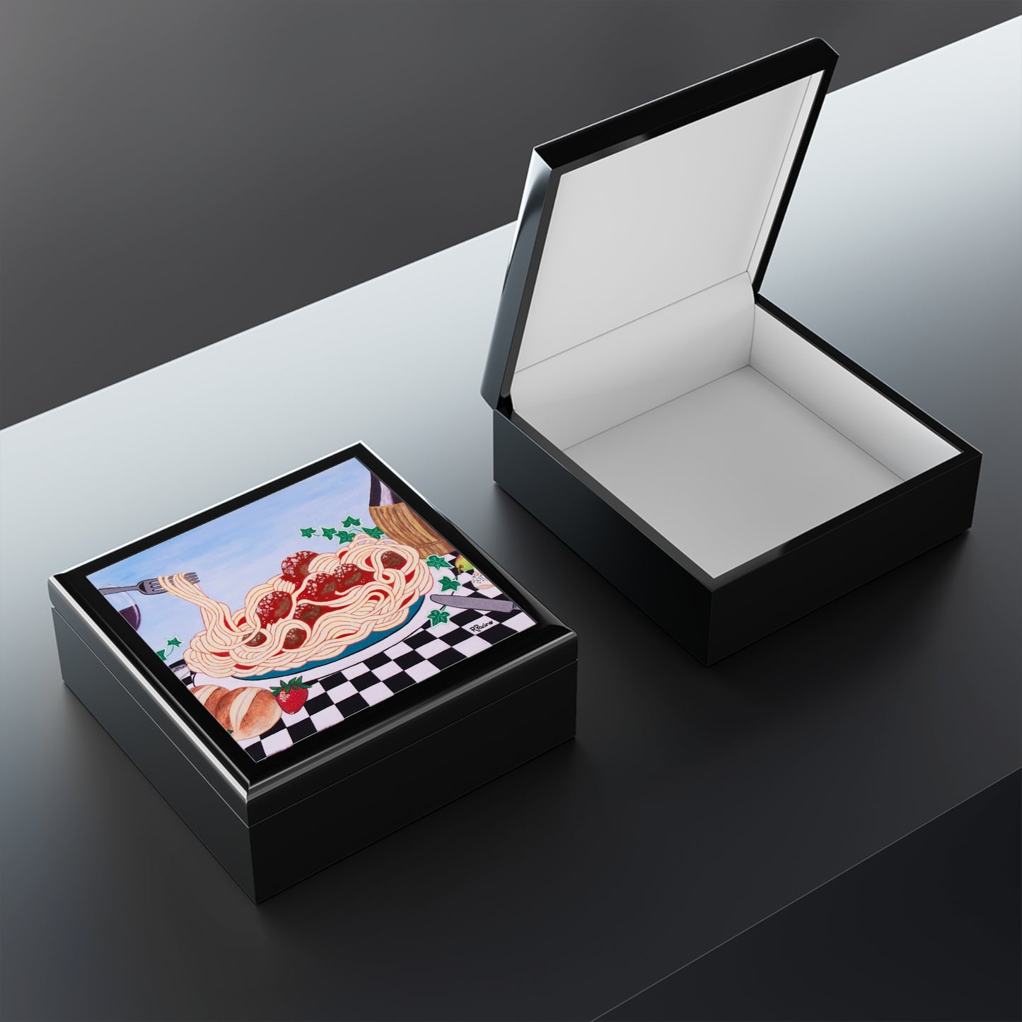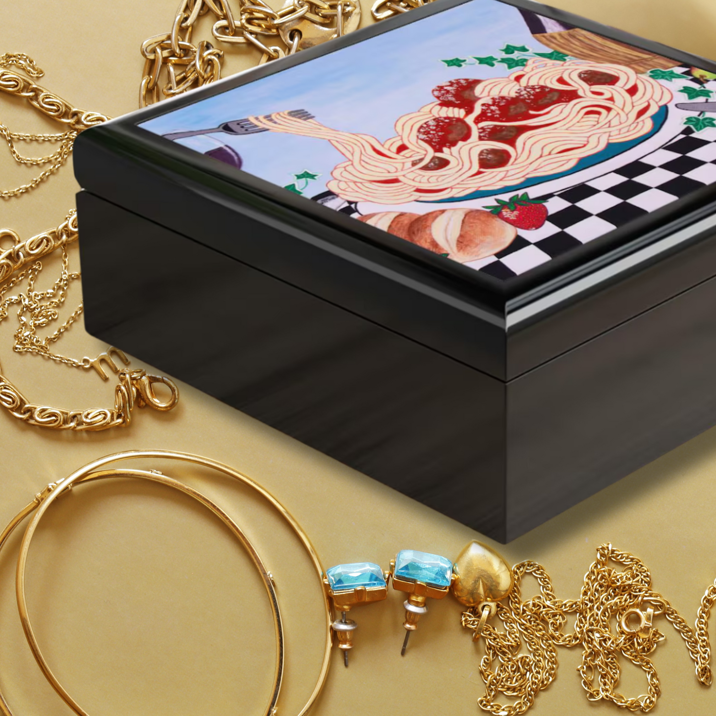 Capture the warmth of Italian culture and the joy of family gatherings with the Sicilian Comfort jewelry box, featuring original artwork by Roberta Pacino. This stunning piece showcases a heartfelt scene of an outdoor spaghetti dinner, set on a classic checkered tablecloth, with a bottle of red wine and the golden glow of a setting sun. Inspired by Roberta’s cherished memories of her father’s Sicilian restaurant, this keepsake box is a beautiful tribute to tradition, togetherness, and culinary heritage.