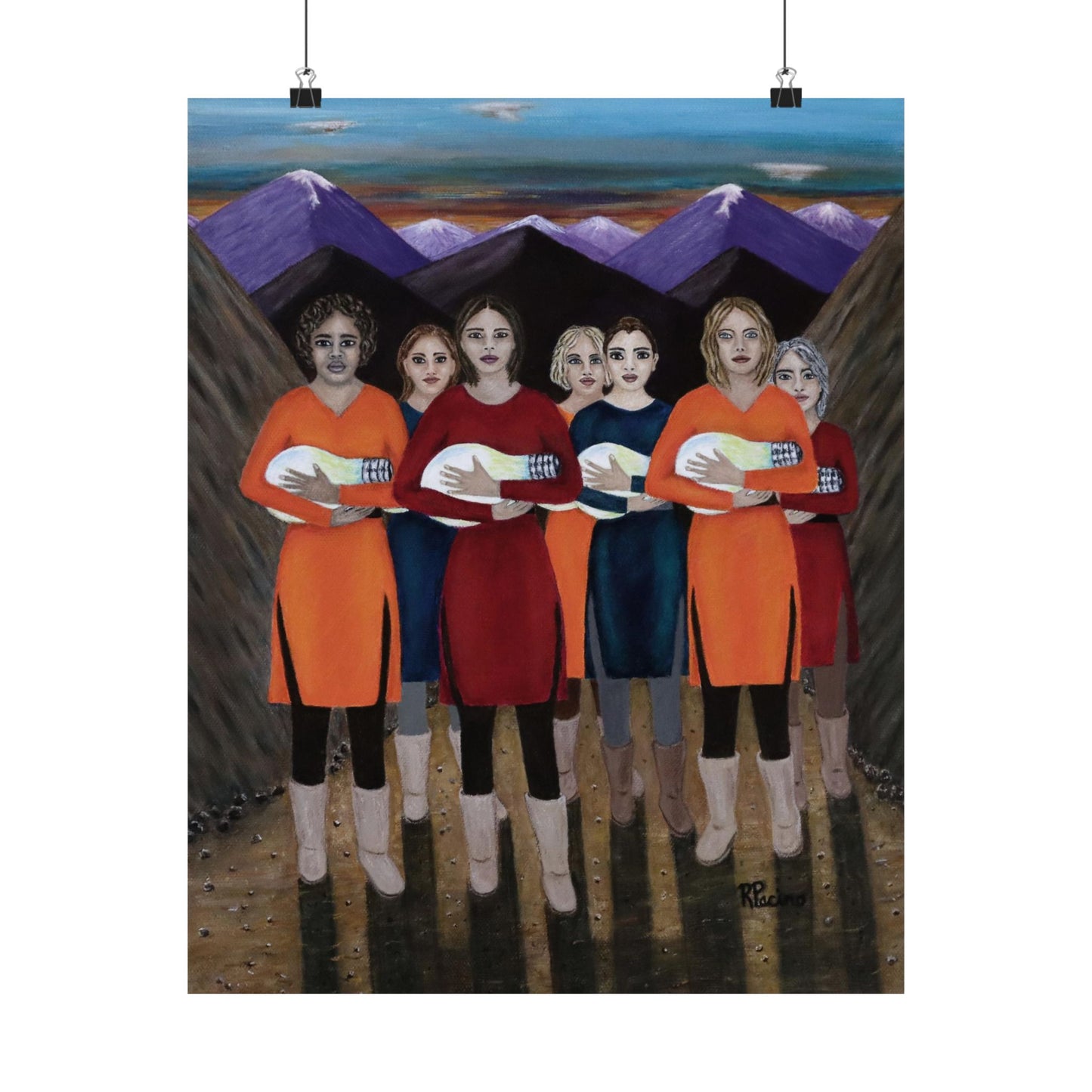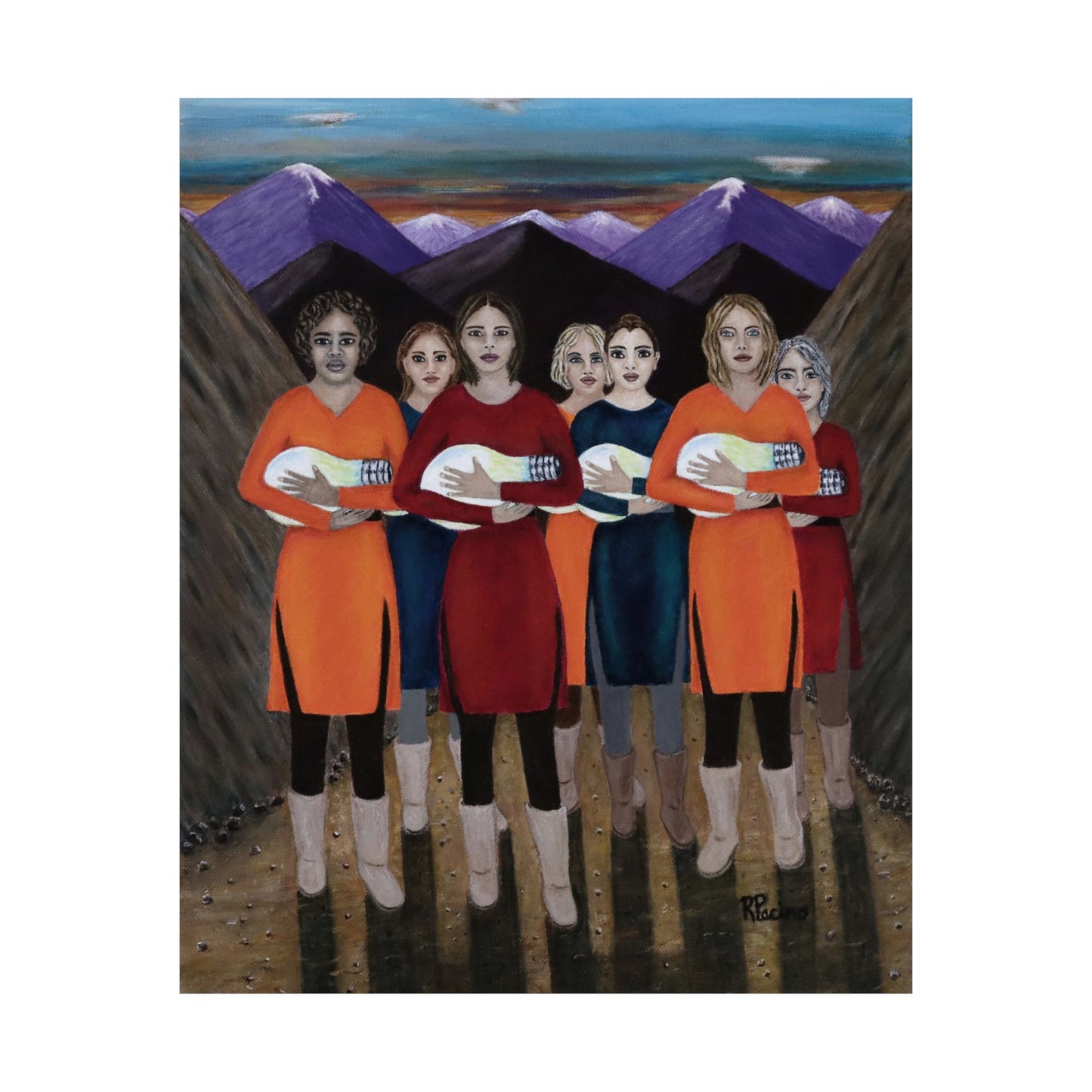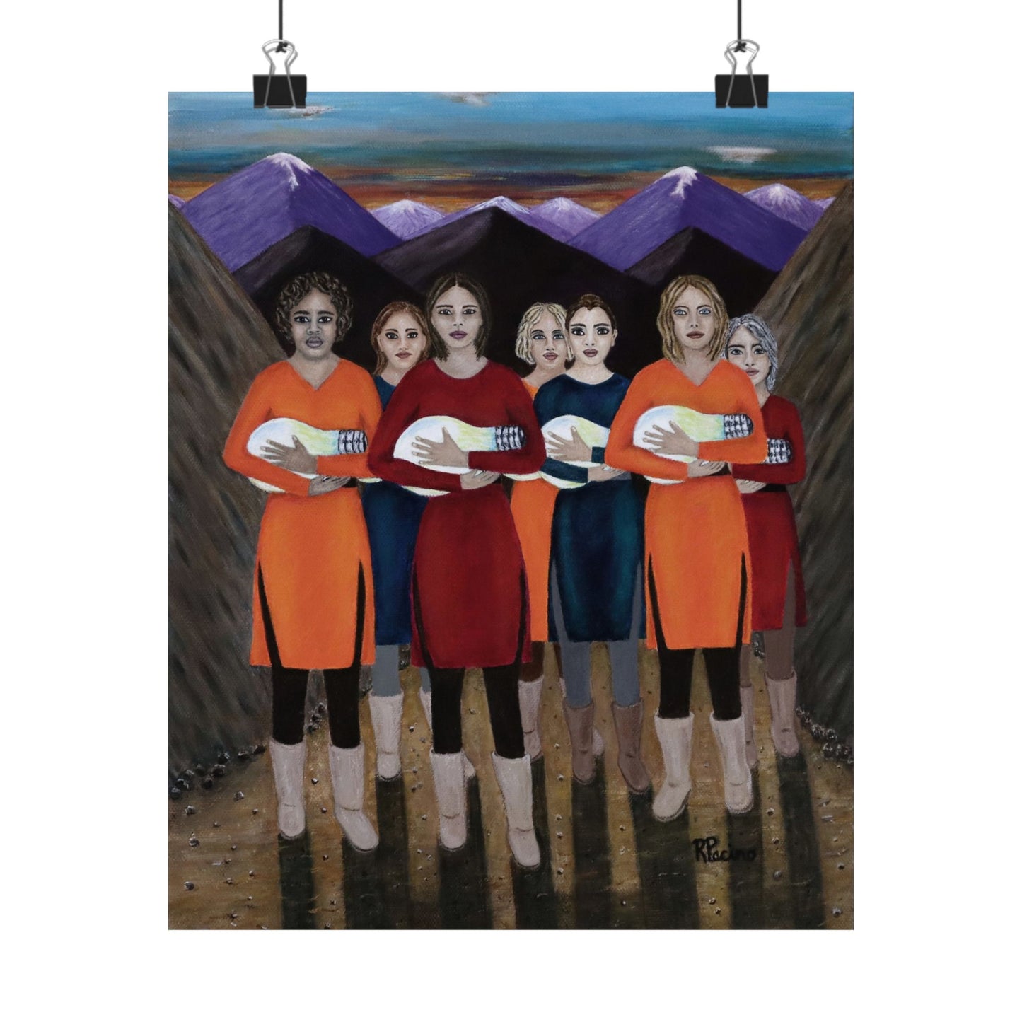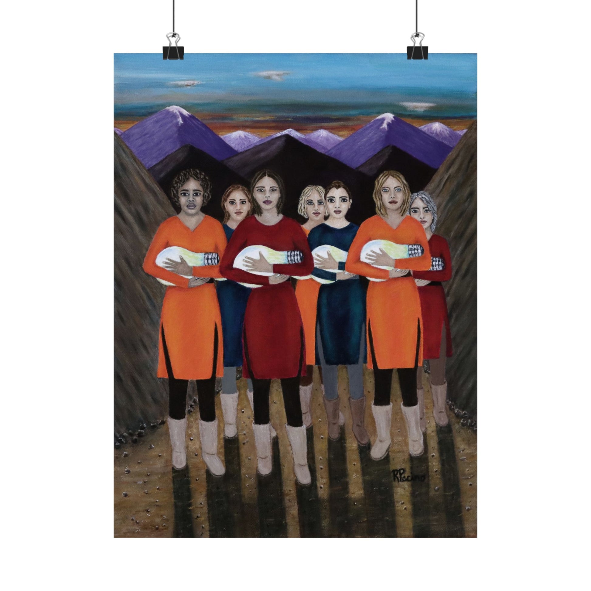 Elevate your space with The Dawning, a powerful fine art print by Roberta Pacino that captures a breathtaking moment at dawn. Emerging from the majestic mountains, seven remarkable women cradle glowing light bulbs like newborns, their illumination symbolizing resilience, wisdom, and the transformative path of self-discovery.