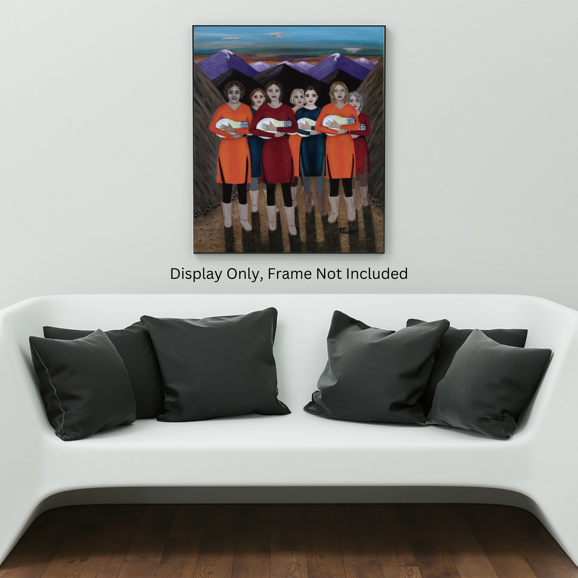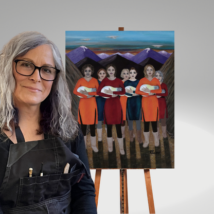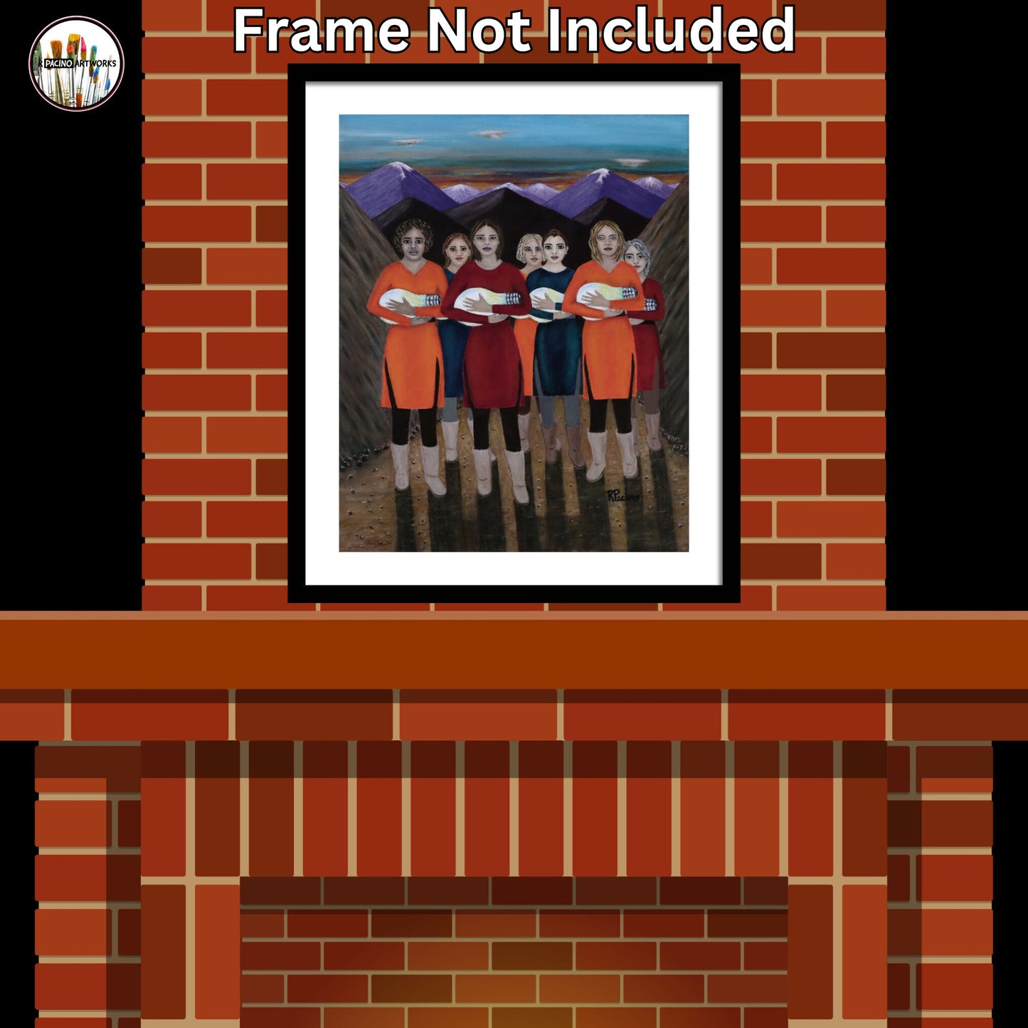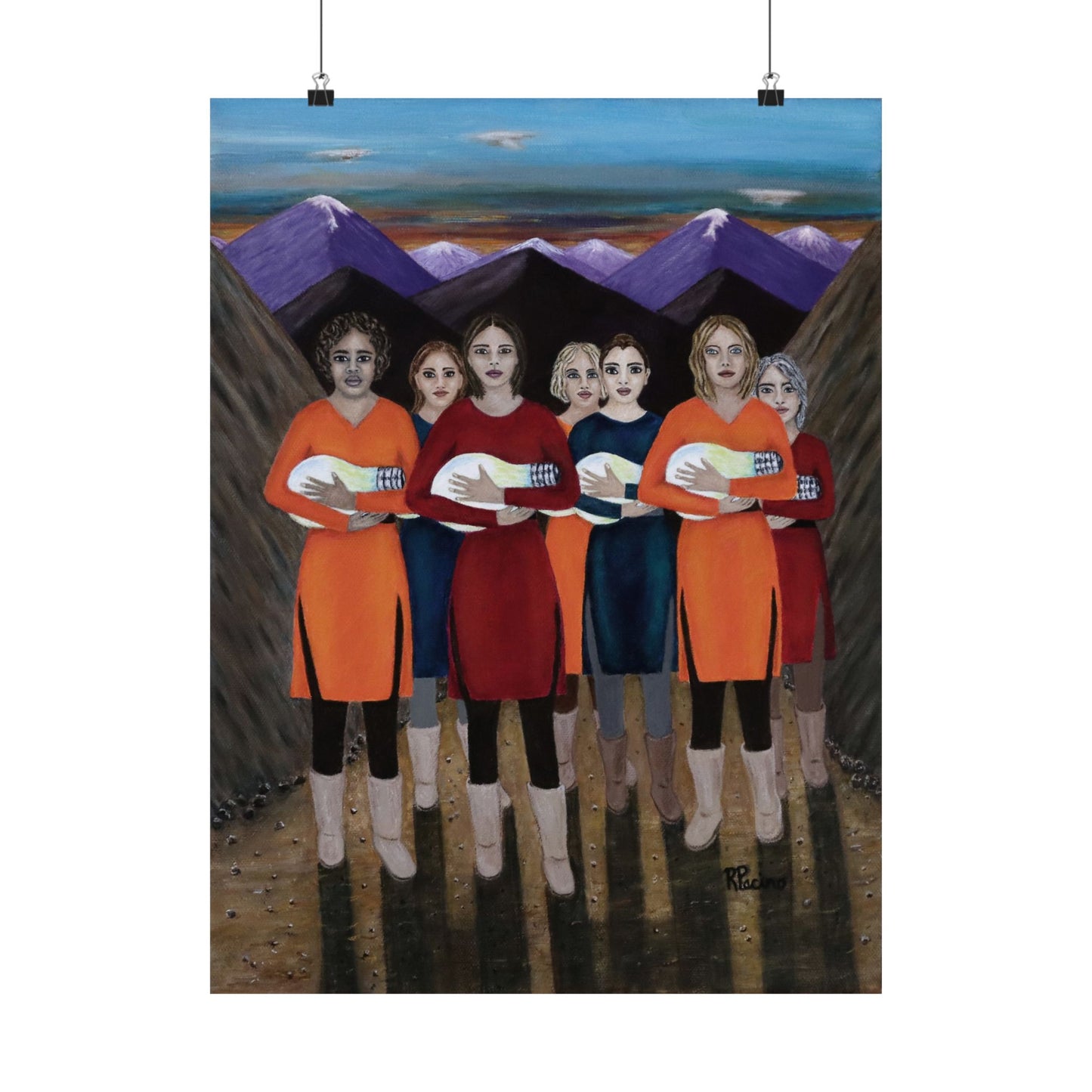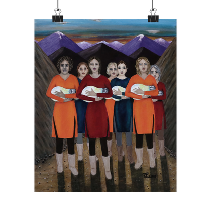 Elevate your space with The Dawning, a powerful fine art print by Roberta Pacino that captures a breathtaking moment at dawn. Emerging from the majestic mountains, seven remarkable women cradle glowing light bulbs like newborns, their illumination symbolizing resilience, wisdom, and the transformative path of self-discovery.