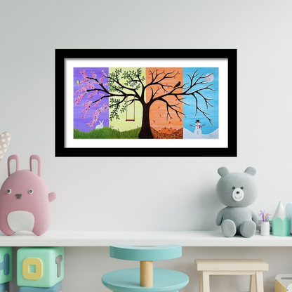 At the heart of this magical composition, a mighty tree stands resilient, connecting the ever-changing energies of spring, summer, autumn, and winter. Within the scene, a whimsical rabbit whispers spring’s secrets, a tree swing invites summer’s carefree joy, a contemplative crow signals autumn’s depth, and a cheerful snowman embodies winter’s serene spirit. Every element holds deeper significance, inviting viewers into a world where nature and imagination intertwine in harmony.